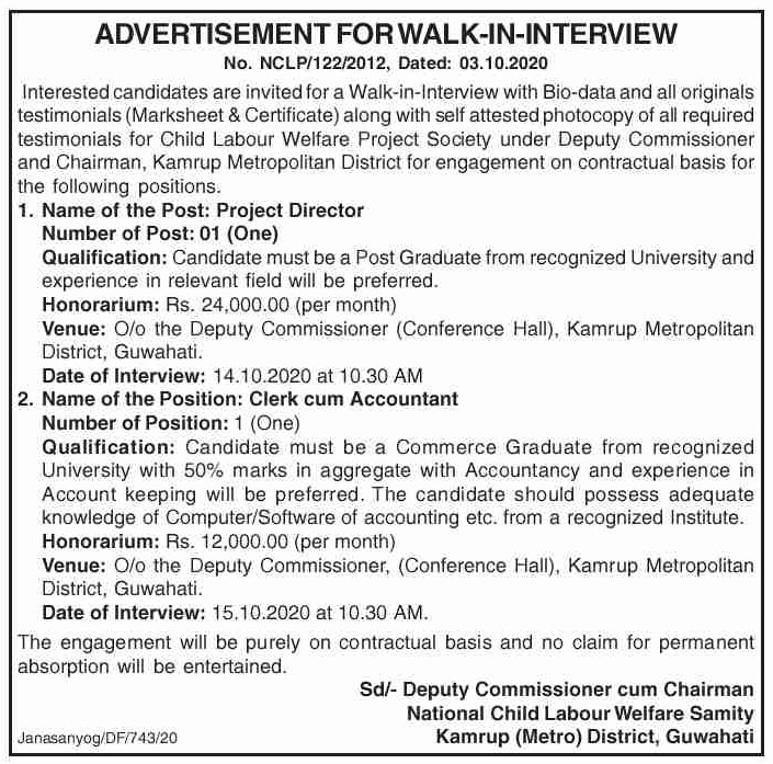 DC Kamrup Metro Recruitment 2020 Interested candidates are invited for a Walk-in-Interview with Bio-data and all originals testimonials (Marksheet & Certificate) along with a self-attested photocopy of all required testimonials for Child Labour Welfare Project Society under Deputy Commissioner and Chairman, Kamrup Metropolitan District
