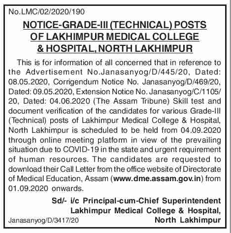 Skill test and document verification of the candidates for various Grade-III (Technical) posts of Lakhimpur Medical College & Hospital, North Lakhimpur is scheduled to be held from 04.09.2020 through online meeting platform in view of the prevailing situation due to COVID-19 in the state and urgent requirement