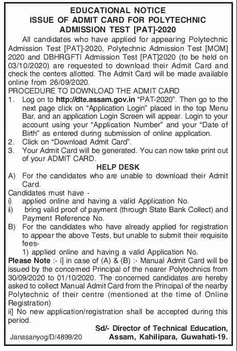 POLYTECHNIC Admit Card 2020, POLYTECHNIC ADMISSION TEST(PAT) 2020 Download your Call Letter.