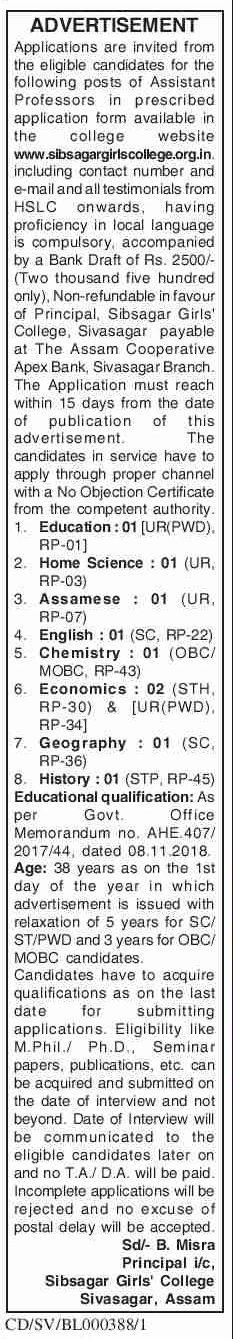 Sibsagar Girls College Recruitment 2020, Applications are invited from the eligible candidates for the following posts of 09 nos Assistant Professors Vacancy
